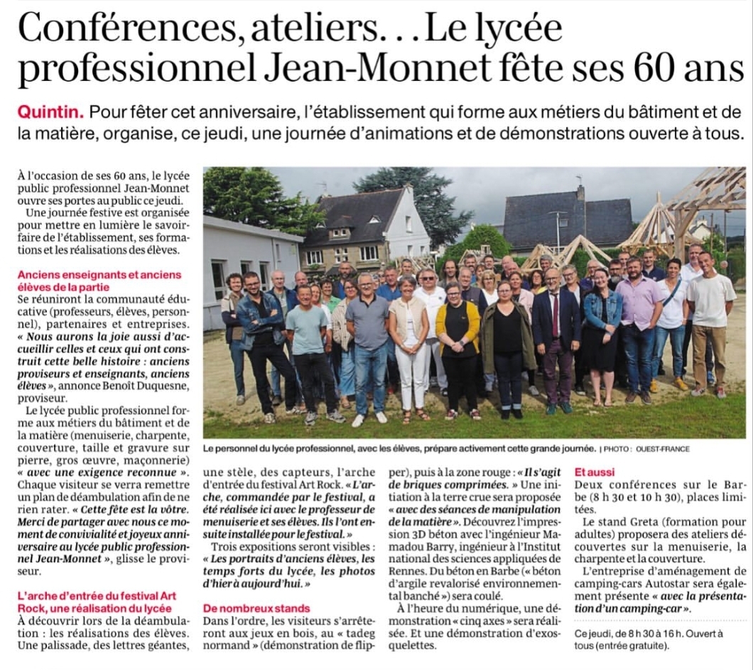En Savoir + Participation à un job-dating En Savoir + Spectacle Le Processus En Savoir + Exposition Dessine-moi L'égalité des genres En Savoir + Visite de l'usine d'eau potable En Savoir + Visite de chantiers à Rennes En Savoir + Remise des diplômes Promo 2025 En Savoir + Réalisations pour Noël En Savoir + Opération Plastique à la loupe En Savoir + Journée nationale de lutte contre le harcèlement En Savoir + Réalisation des 2ndeTMA pour Carnavalorock Fresque de la pollution plastique En Savoir + Quand la construction rencontre l'écologie En Savoir + Les CAP au temps des bâtisseurs En Savoir + Remise du Prix de l'Engagement Fondation Colbert En Savoir + Concours du Meilleur Apprenti de France 2025 En Savoir + Descente en rappel Grimpe d'arbres En Savoir + Cité des Télécoms En Savoir + Départ des 2ndes SNU En Savoir + Exposition Voyage chromatique En Savoir + Remise des prix Non Au Harcèlement En Savoir + Décors pour Art Rock En Savoir +