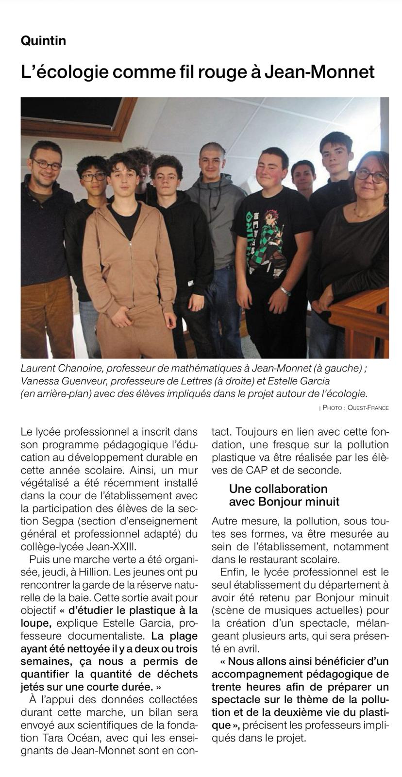 Réalisations pour Noël En Savoir + Opération Plastique à la loupe En Savoir + Journée nationale de lutte contre le harcèlement En Savoir + Réalisation des 2ndeTMA pour Carnavalorock Fresque de la pollution plastique En Savoir + Quand la construction rencontre l'écologie En Savoir + Les CAP au temps des bâtisseurs En Savoir + Remise du Prix de l'Engagement Fondation Colbert En Savoir + Concours du Meilleur Apprenti de France 2025 En Savoir + Descente en rappel Grimpe d'arbres En Savoir + Cité des Télécoms En Savoir + Départ des 2ndes SNU En Savoir + Exposition Voyage chromatique En Savoir + Remise des prix Non Au Harcèlement En Savoir + Décors pour Art Rock En Savoir + Festival JOSE En Savoir + Inauguration de l'abri bus construit par les lycéens En Savoir + Atelier théâtral sur la Parentalité En Savoir + Tournage lecture Anne Frank En Savoir + Participation des TBORGO à un film documentaire En Savoir + Visite de l'usine de production d'eau potable En Savoir + Réalisation d'un petit train pour une école En Savoir + Les Worldskills au lycée Jean Monnet En Savoir + Opération nettoyons la nature En Savoir + Venue du Ministre Alexandre Portier En Savoir + Les 1TMA découvrent les métiers du bois au théâtre En Savoir + Visite de chantier COOPERL à Lamballe Découverte du parc éolien Traversée de la Baie de Saint Brieuc En Savoir + Eco-délégués Visite du parc éolien En Savoir + Prix NON AU HARCELEMENT En Savoir + 2nde 1 Finalisation de l'atelier photo GwinZegal En Savoir + 1èreTMA Décors Art Rock En Savoir +